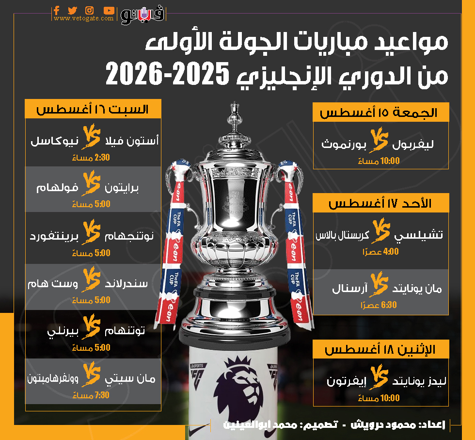 مواعيد مباريات الجولة الأولى من الدوري الإنجليزي 2025-2026 (إنفوجراف)