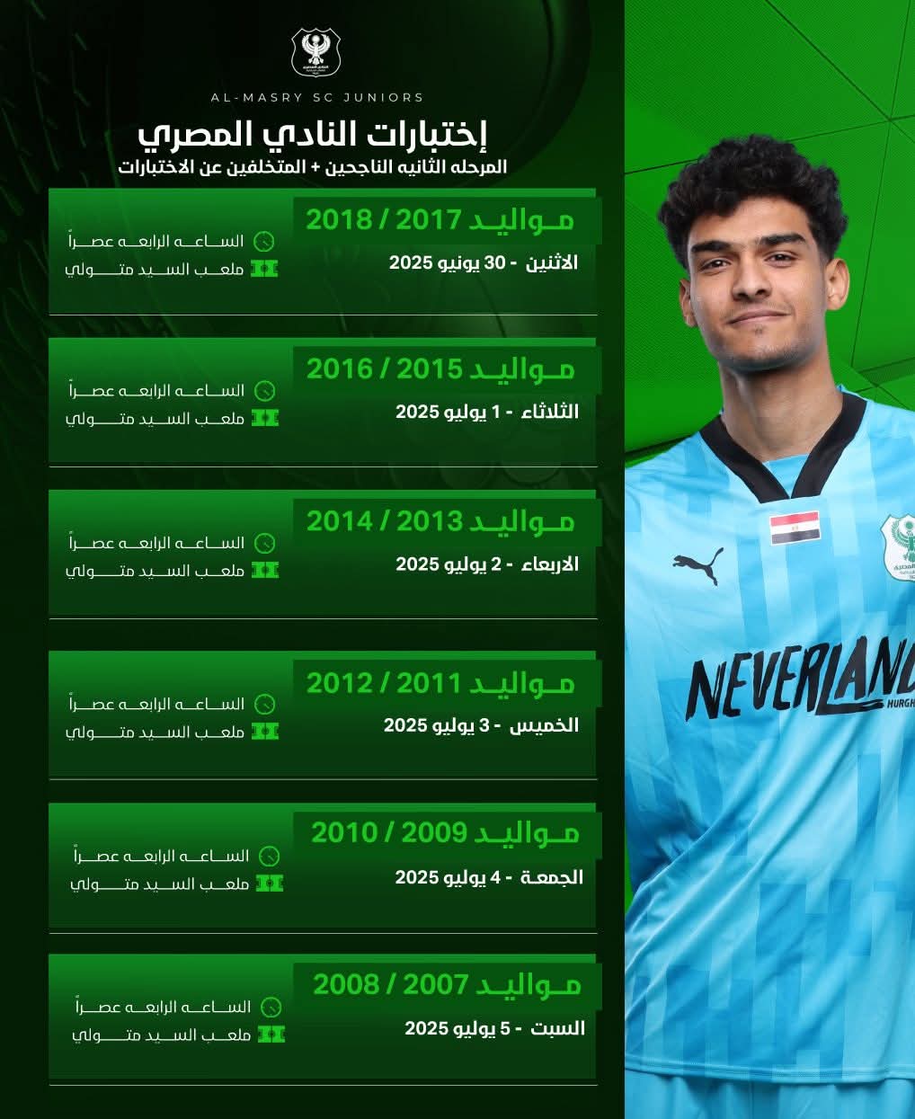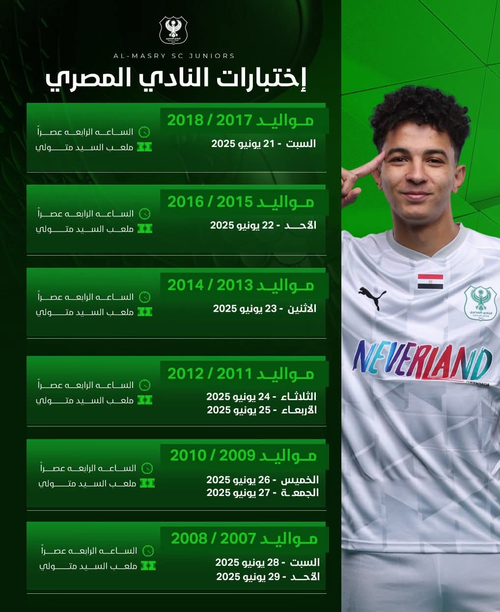 اختبارات الناشئين 2025، أعلن النادي المصري البورسعيدي جدول مواعيد اختبارات الناشئين بالنادي البورسعيدي موسم 2025-2026.