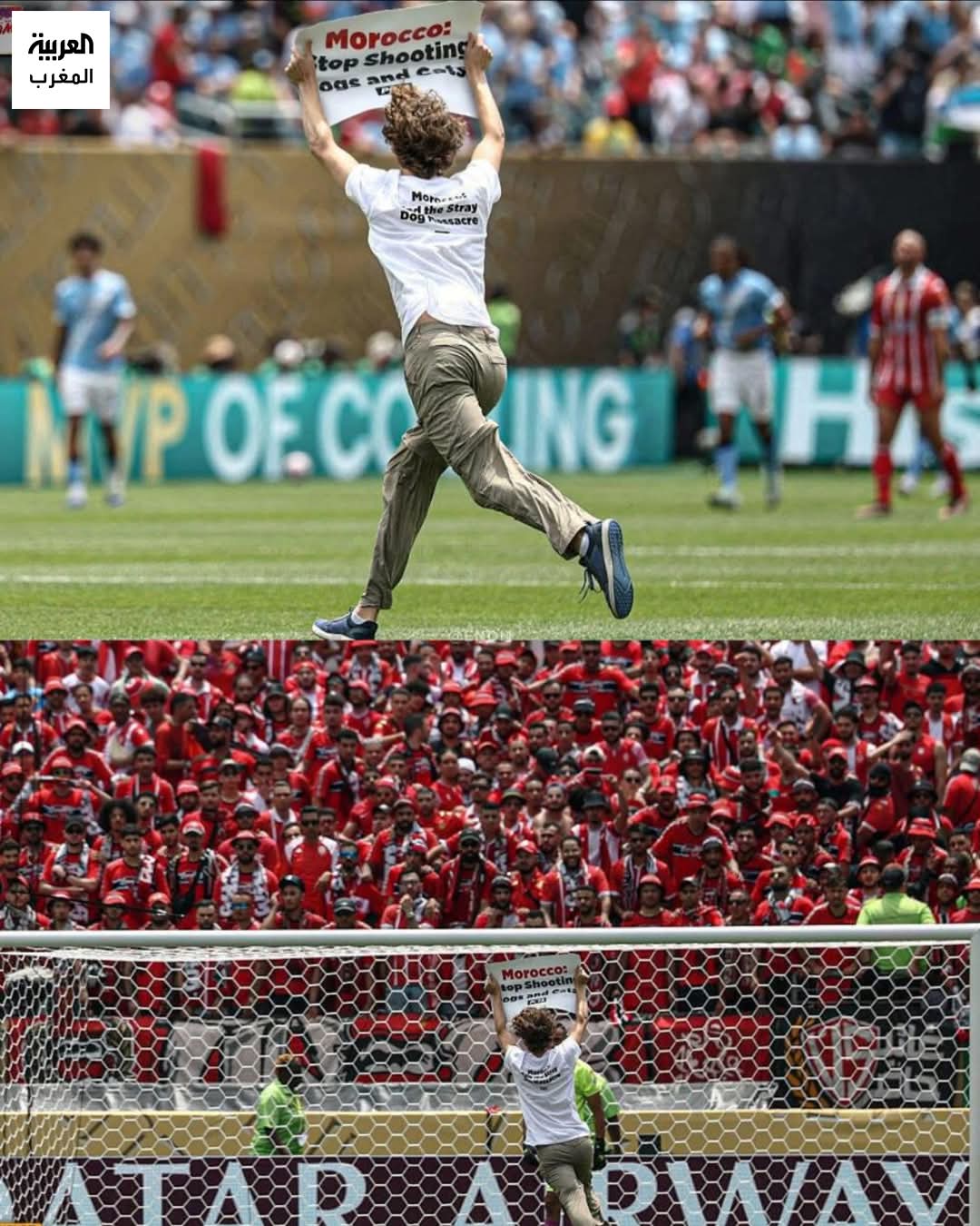مشجع يقتحم ملعب مباراة الوداد ومانشستر سيتي بلافتة لدعم القطط والكلاب (صور)