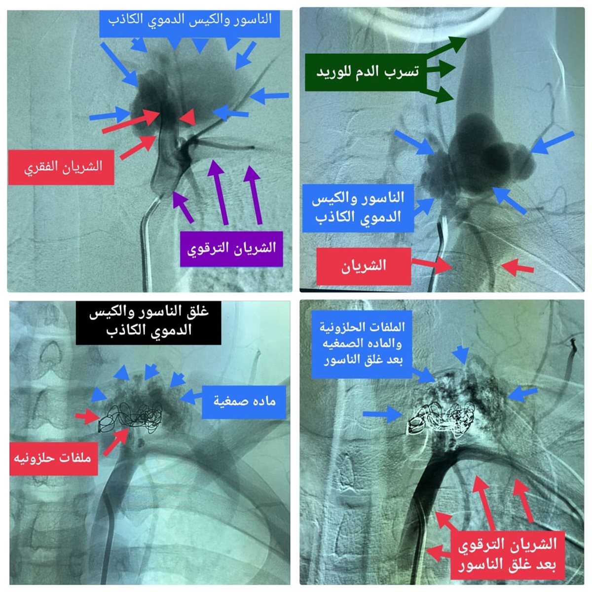 ونظرا لخطورة العملية، على الفور تشكل الفريق الطبي برئاسة الأستاذ الدكتور مصطفى هاشم أستاذ الأشعة التشخيصية التداخلية بجامعة أسيوط، وضم كل من الدكتور محمود رفعت عبدالظاهر مدرس بالقسم، وعاونهما الطبيب محمد عبدالوهاب مدرس مساعد بالقسم، ليقوموا بإغلاق التكيس الدموي والناسور باستخدام الملفات الحلزونية ذاتية الانفصال وتثبيتها بالمواد الصمغية المجلطة بنجاح وبدون حدوث أي غلق لشريان الذراع الرئيسي المجاور، لتستقر حالة المريض بعد ذلك دون حدوث أي مضاعفات.