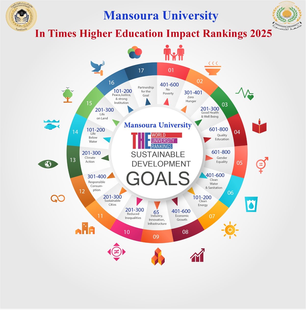 وقد حققت جامعة المنصورة نتائج متقدّمة في تصنيف التايمز البريطاني للتأثير في التنمية المستدامة 2025، الذي شهد منافسةً بين 51 جامعة مصرية و2300 جامعة عالمية من 130 دولة، حيث صعدت إلى المرتبة الأولى مصريًّا والـ65 عالميًّا في الهدف التاسع (الصناعة والابتكار والبنية التحتية) بتقدُّم خمس مراتب.