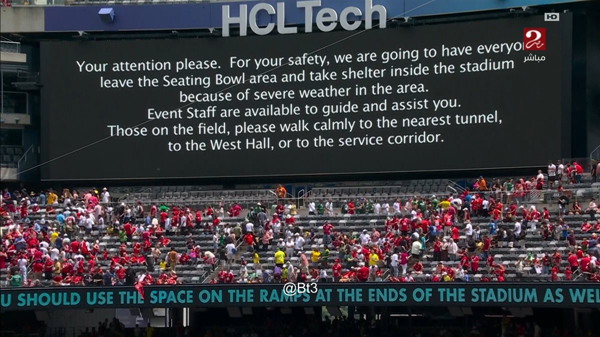 وقال إبراهيم فايق: "تحذير من شرطة نيوجيرسي: توقف المباراة بسبب ظروف طقس قاسية.. ومطالبة اللاعبين بالدخول لغرفة الملابس.. وخروج الجماهير للوقوف في ممرات المدرجات حرصا ع سلامتهم وأمنهم".