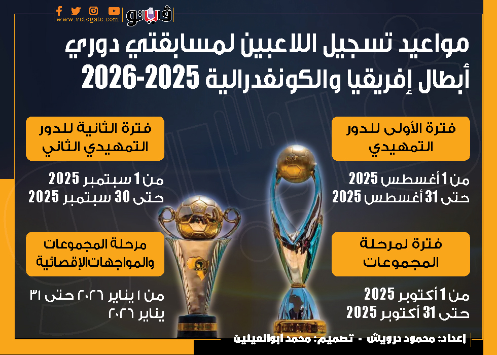 مواعيد تسجيل اللاعبين لمسابقتي دوري أبطال إفريقيا والكونفدرالية 2025-2026 (إنفوجراف)