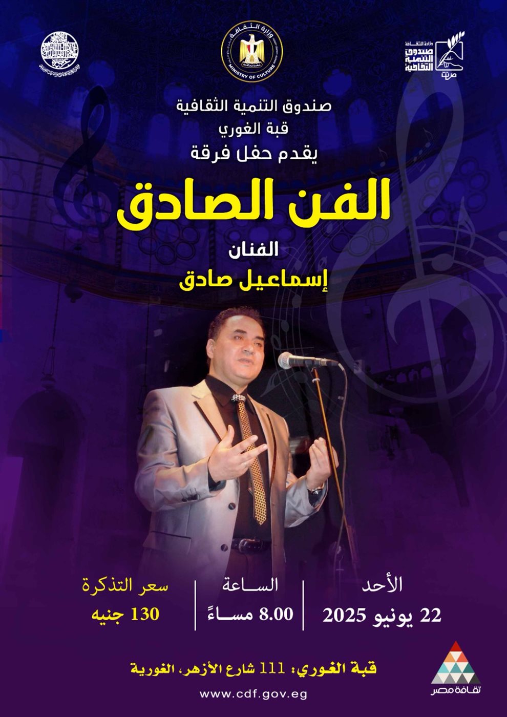 ينظم قطاع صندوق التنمية الثقافية برئاسة المعماري حمدي السطوحي، حفلًا فنيًا جديدًا لفرقة "الفن الصادق" بقيادة الفنان إسماعيل صادق، وذلك في تمام الساعة الثامنة من مساء الأحد 22 يونيو بمركز إبداع قبة الغوري بشارع الأزهر.