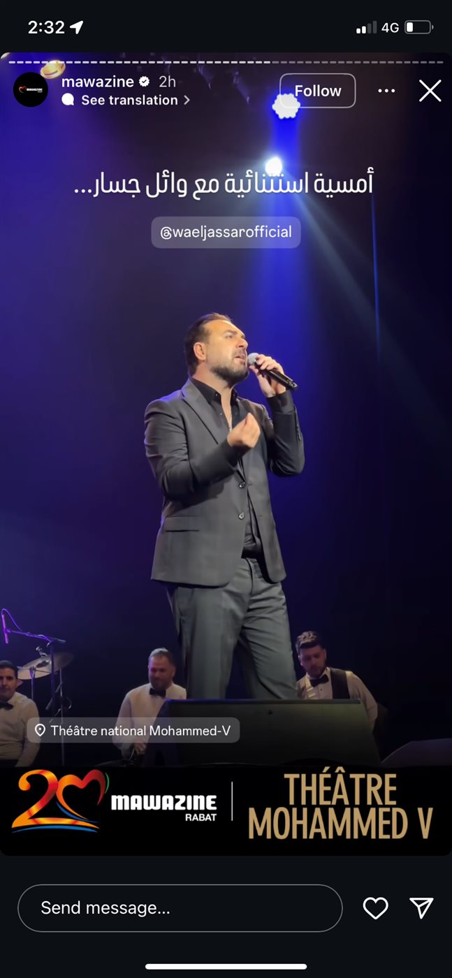 أحيا الفنان اللبناني وائل جسار، حفلا غنائيا ضمن فعاليات مهرجان موازين بالمغرب في دورته الـ 20 وسط حضور جماهيري كبير.