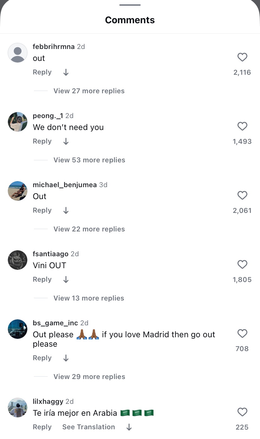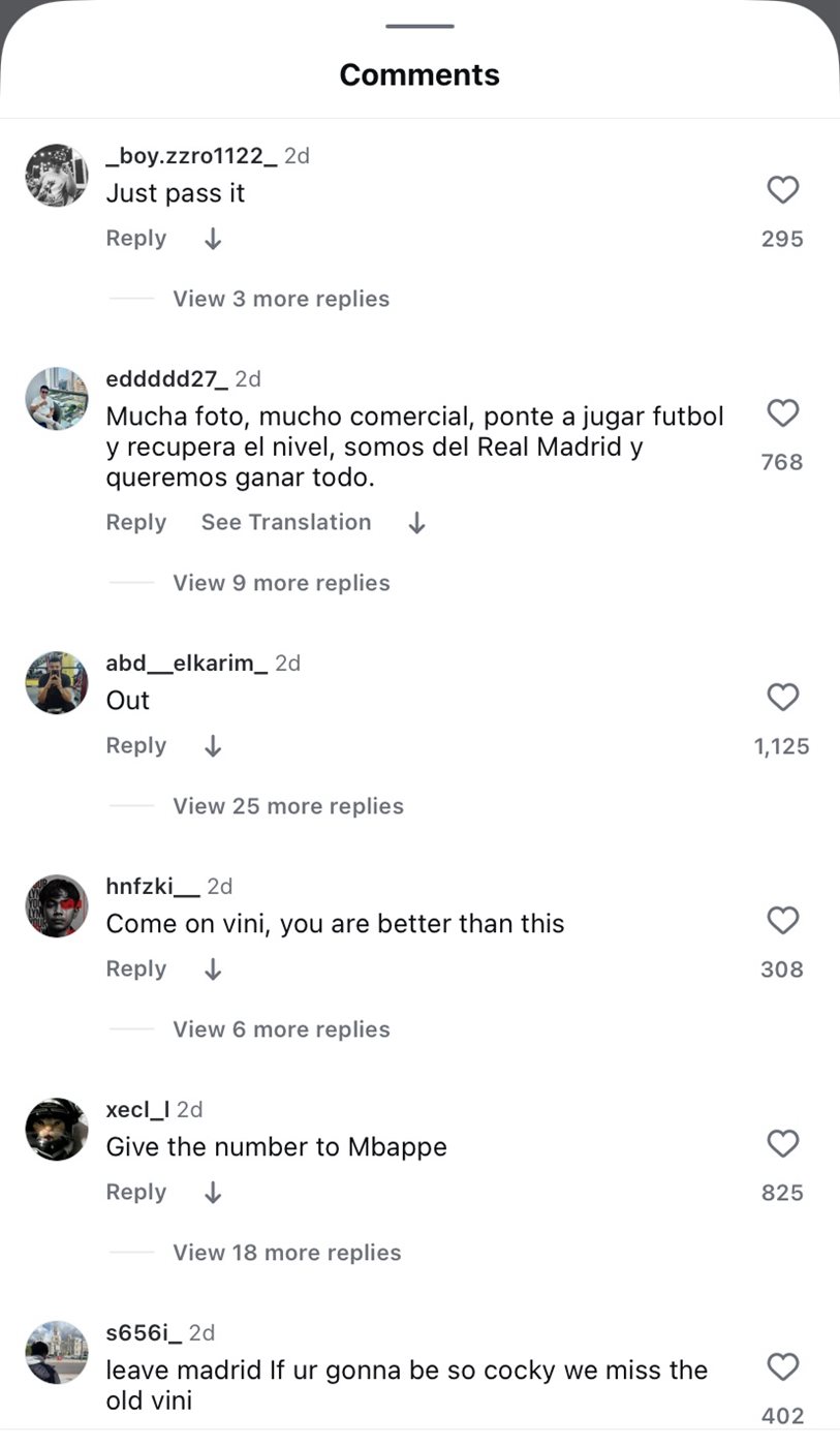 وتوالى هجوم جماهير ريال مدريد على فينيسيوس جونيور في التعليقات على انستجرام.