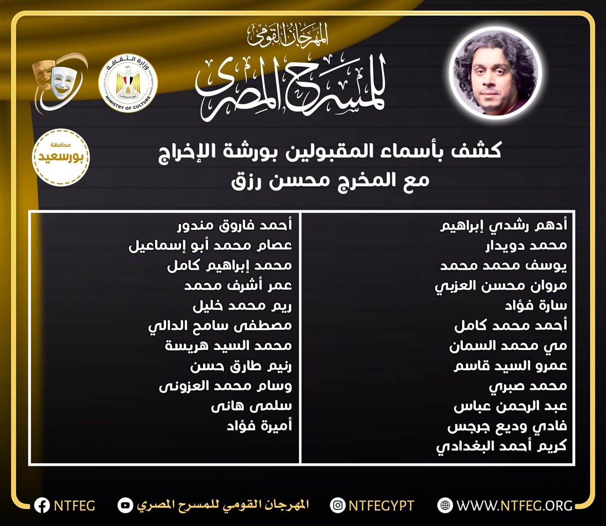 كشف المهرجان القومي للمسرح المصري في دورته الثامنة عشرة برئاسة الفنان محمد رياض، عن أسماء المقبولين للمشاركة في ورشة الإخراج والتي يقدمها المخرج محسن رزق في محافظة بورسعيد ضمن فعاليات دورة العام الحالي 2025.