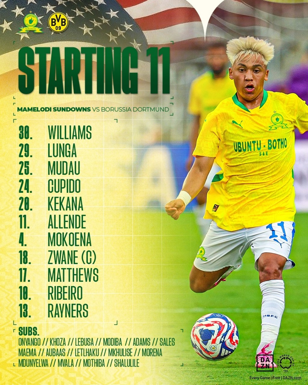 وسجل لوكاس ريبيرو كوستا الهدف الأول لـ صن داونز من مهارة فردية رائعة بالدقيقة 11، قبل أن يتعادل بوروسيا دورتموند عن طريق فيليكس نميتشا في الدقيقة 16 بعد خطأ فادح من ويليامز حارس مرمى الفريق الجنوب أفريقي.