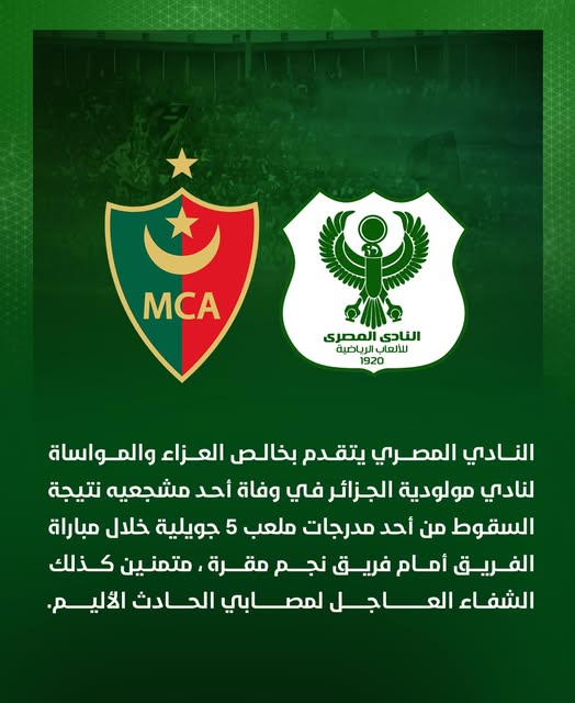 المصري البورسعيدي يعزي مولودية الجزائر بعد وفاة مشجعه