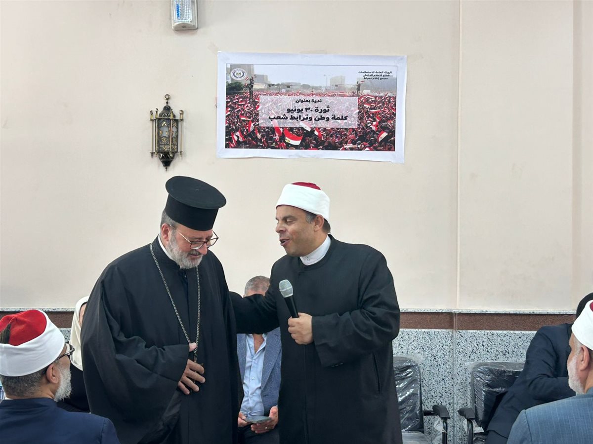 نظم مجمع إعلام دمياط، التابع للهيئة العامة للاستعلامات، ندوة تثقيفية تحت عنوان "ثورة 30 يونيو.. كلمة وطن وترابط شعب"، وذلك بالتعاون مع مديريتي الأوقاف والصحة وكنيسة الروم الأرثوذكس، ضمن فعاليات الاحتفال بالذكرى المجيدة للثورة، وتحت رعاية الكاتب الصحفي الدكتور ضياء رشوان، رئيس الهيئة العامة للاستعلامات.