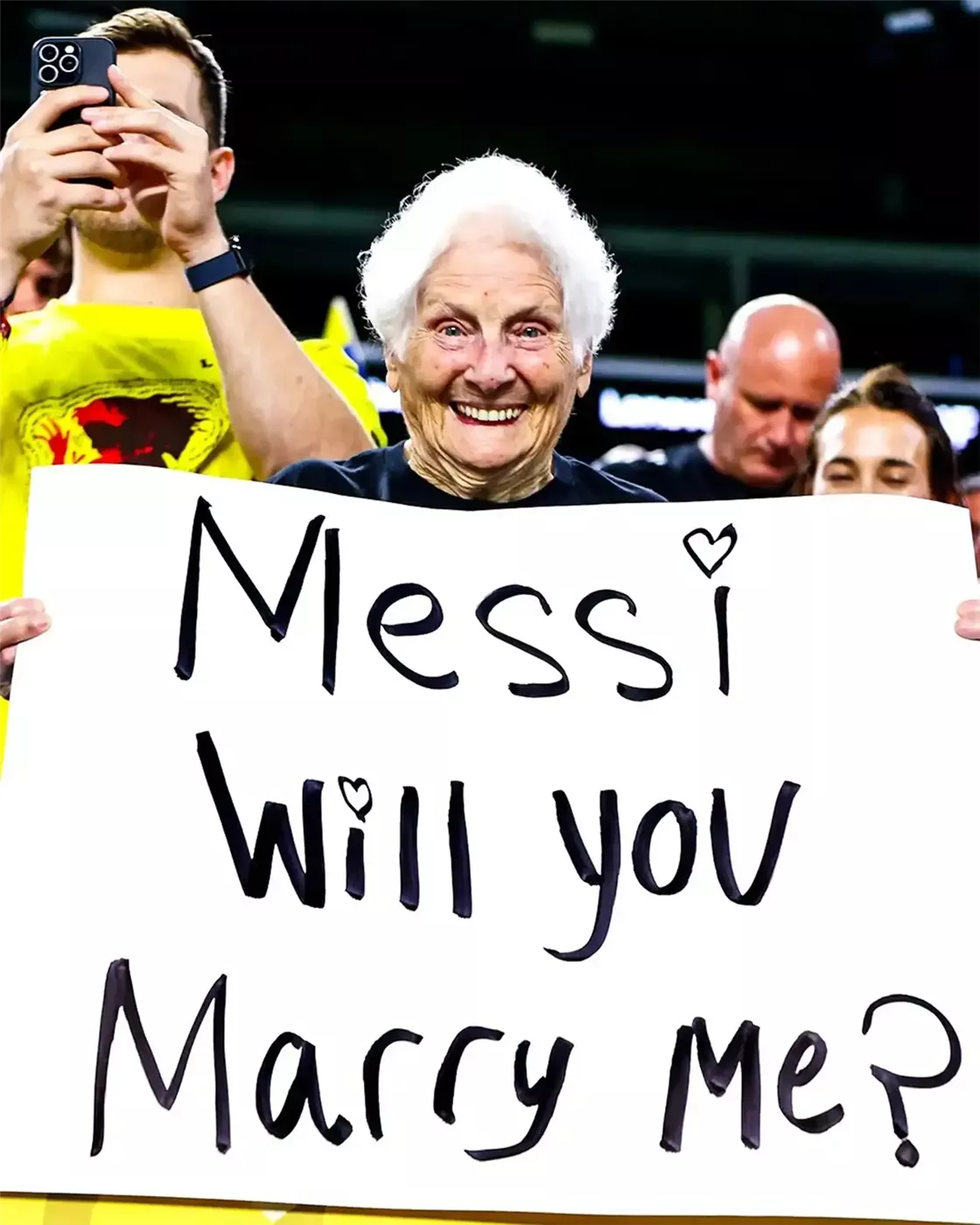 بينما كان الجمهور يتدفق إلى الملعب لمشاهدة المواجهة الحاسمة، رفعت سيدة عجوز لافتة غريبة من المدرجات موجهة إلى ميسي، كُتب عليها بخط واضح: "ميسي، هل تتزوجني؟".