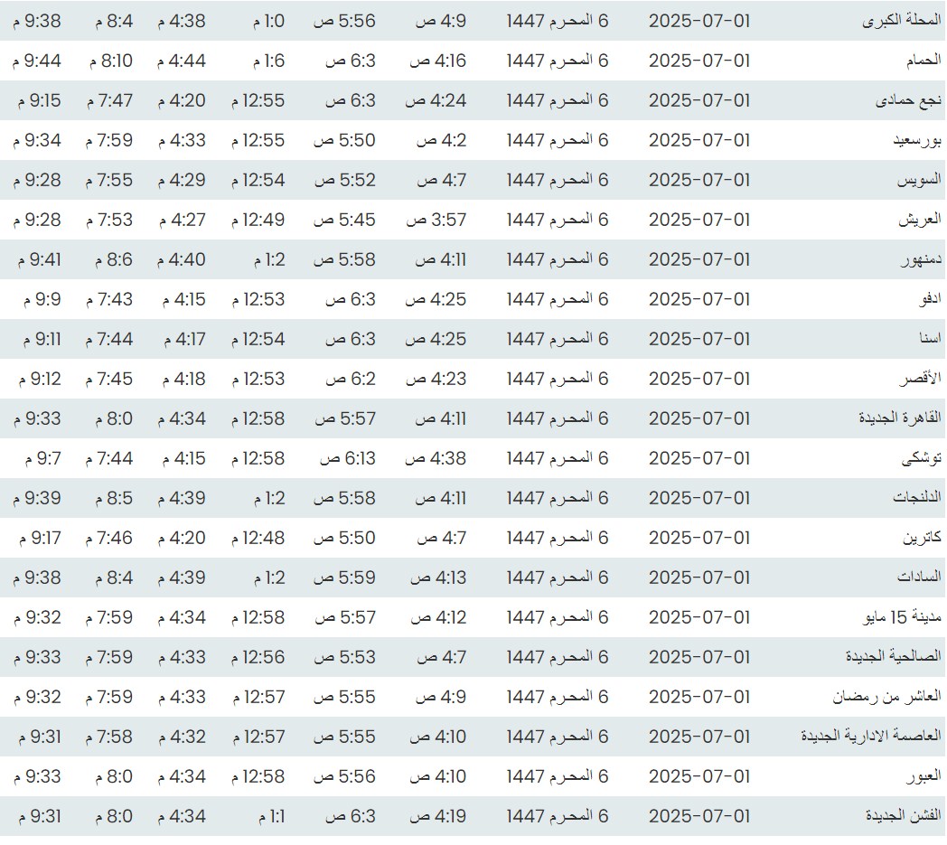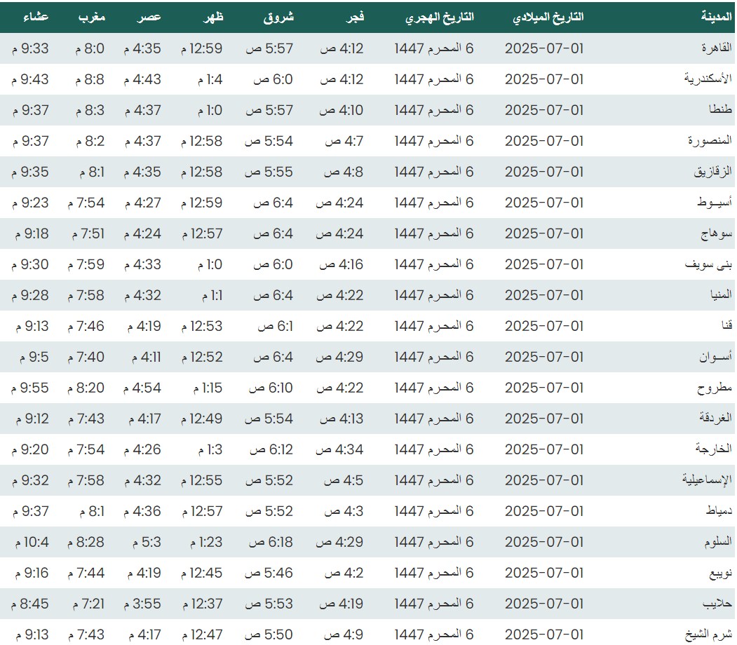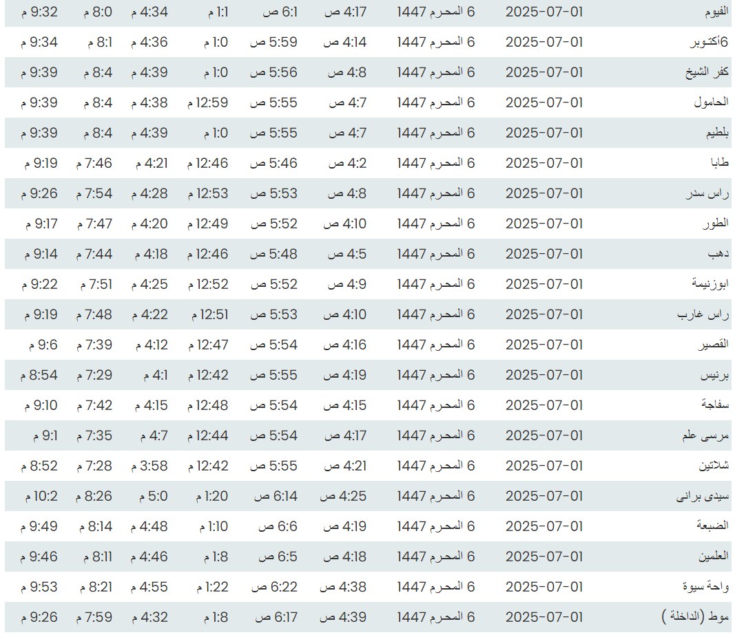 وفيما يلي مواقيت الصلاة، لعدد من مدن ومحافظات الجمهورية من واقع بيانات الهيئة العامة للمساحة