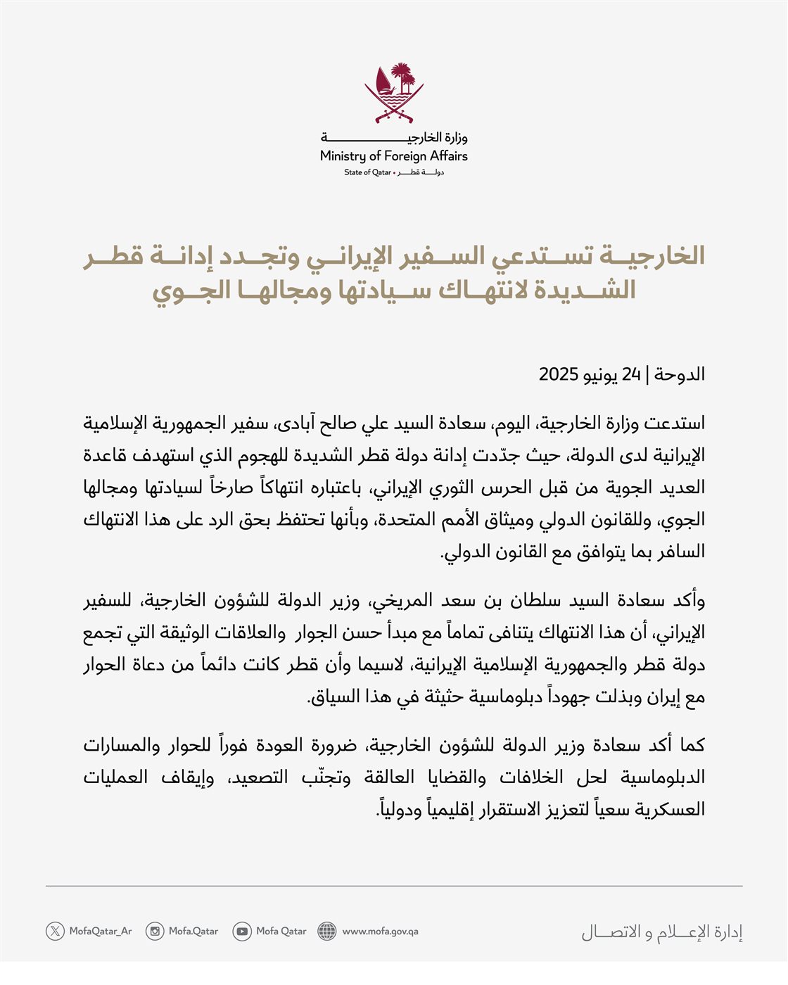 وقالت وزارة الخارجية القطرية، إنها استدعت سفير الجمهورية الإسلامية الإيرانية لدى الدولة،على صالح آبادى، حيث جددت إدانة دولة قطر الشديدة للهجوم الذي استهدف قاعدة العديد الجوية من قبل الحرس الثوري الإيراني، باعتباره انتهاكا صارخا لسيادتها ومجالها الجوي، وللقانون الدولي وميثاق الأمم المتحدة، وبأنها تحتفظ بحق الرد على هذا الانتهاك السافر بما يتوافق مع القانون الدولي.