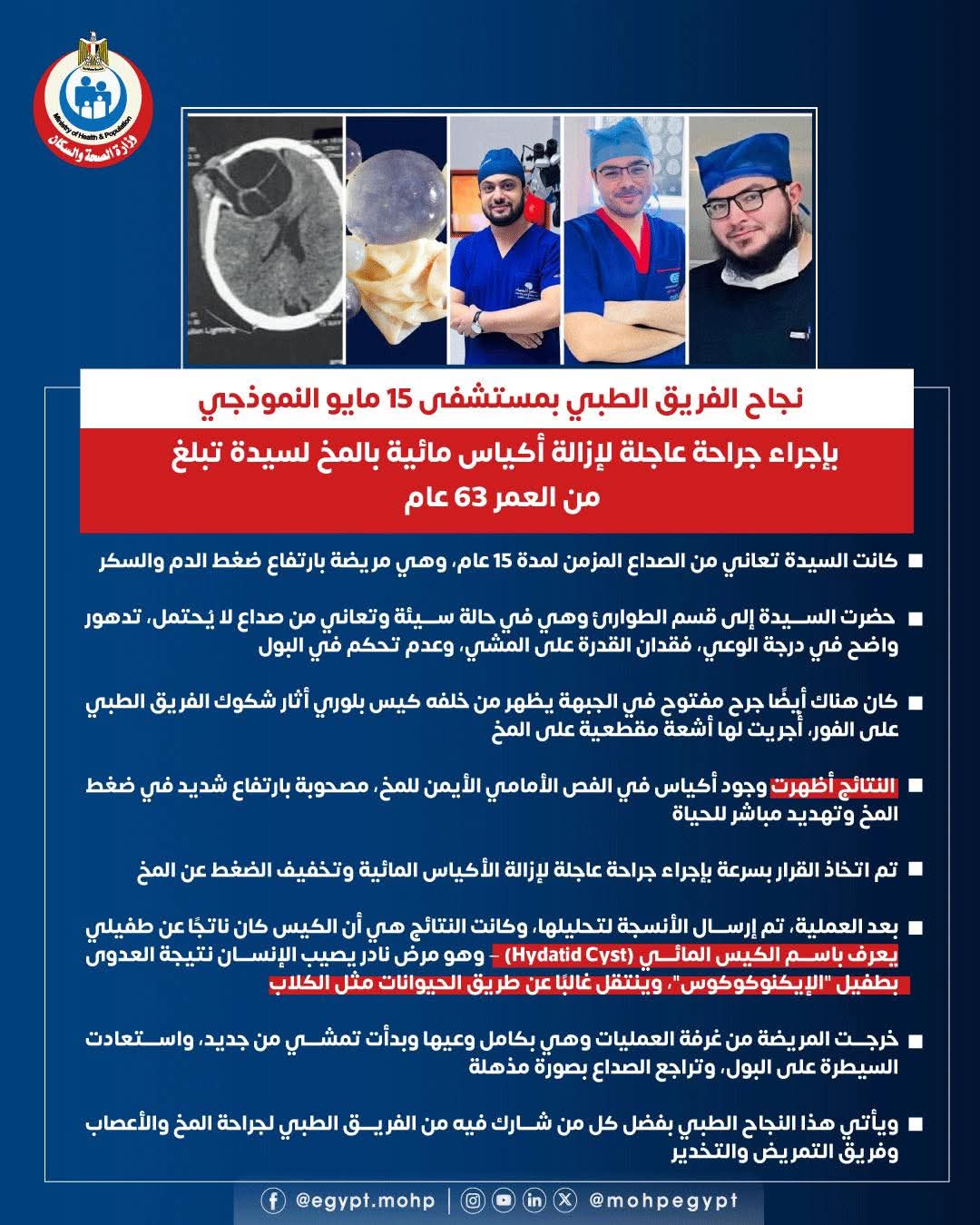 أعلنت وزارة الصحة عن نجاح الفريق الطبي بمستشفى ١٥ مايو النموذجي، في إجراء جراحة عاجلة لإزالة أكياس مائية بالمخ لسيدة تبلغ من العمر 63 عاما.