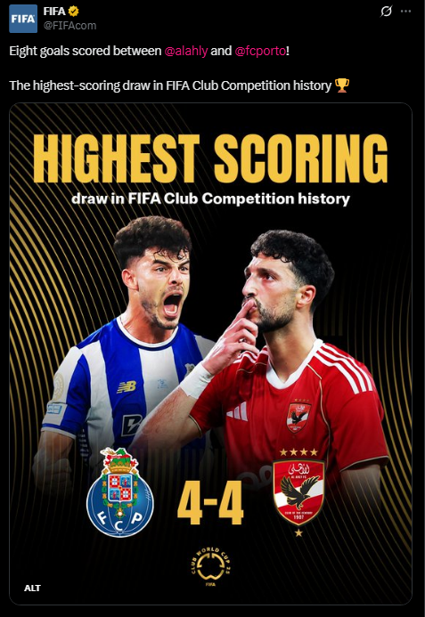 سجلت مواجهة النادي الأهلي مع نظيره بورتو البرتغالي، التي انتهت بنتيجة 4-4 ضمن منافسات دور المجموعات ببطولة كأس العالم للأندية 2025، رقما تاريخيا في سجلات الاتحاد الدولي لكرة القدم "فيفا".
