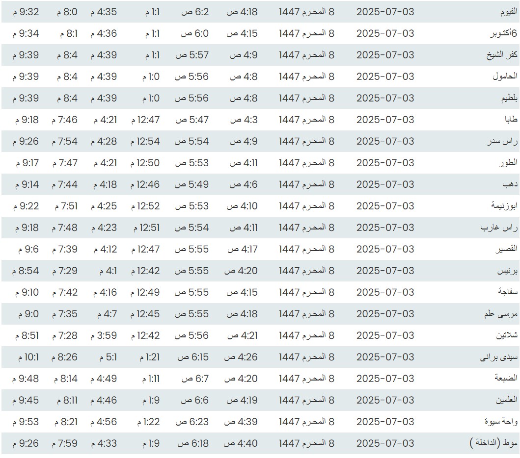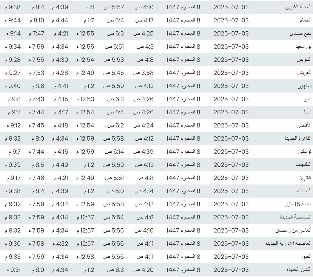 وفيما يلي مواقيت الصلاة، لعدد من مدن ومحافظات الجمهورية من واقع بيانات الهيئة العامة للمساحة