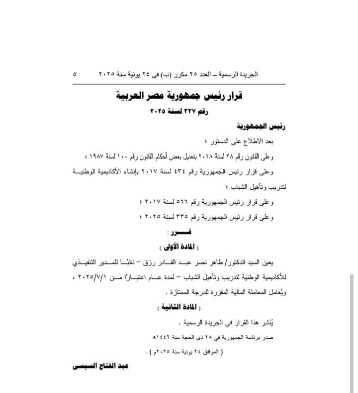 كما أصدر الرئيس عبد الفتاح السيسي قرارًا جمهوريًّا رقم 327 لسنة 2025 بتعيين الدكتور طاهر نصر عبد القادر رزق نائبًا للمدير التنفيذي للأكاديمية الوطنية لتدريب وتأهيل الشباب وتأهيل العاملين بالجهاز الإداري للدولة وذلك لمدة عام اعتبارا من الأول من يوليو المقبل.