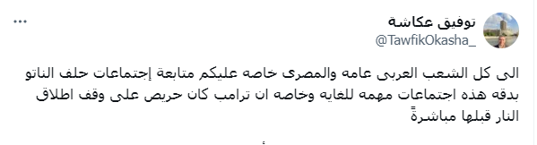 وقال توفيق عكاشة في رسالته إلى الشعب المصري وكل الشعوب العربية: "إلى كل الشعب العربى عامة والمصرى خاصة عليكم متابعة اجتماعات حلف الناتو بدقه هذه اجتماعات مهمه للغايه وخاصه ان ترامب كان حريص على وقف إطلاق النار قبلها مباشرةً"