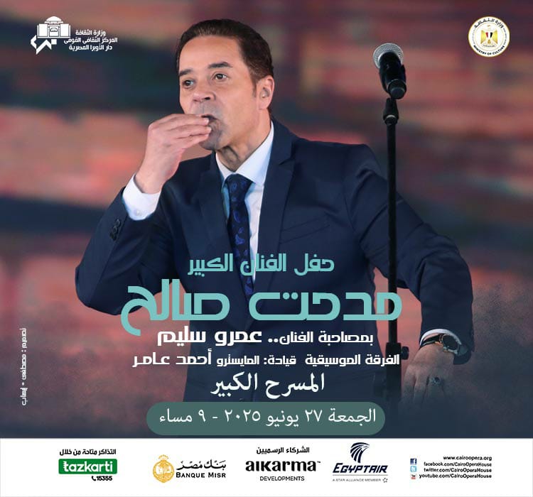 تحتضن دار الأوبرا المصرية برئاسة الدكتور علاء عبد السلام حفلًا للنجم مدحت صالح بمشاركة الموزع الموسيقى وعازف البيانو عمرو سليم ومصاحبة الفرقة الموسيقية بقيادة المايسترو أحمد عامر وذلك في التاسعة مساء الجمعة ٢٧ يونيو على المسرح الكبير ضمن فعاليات وزارة الثقافة.
