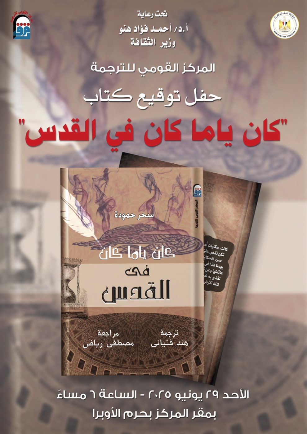 يقيم المركز القومي للترجمة برئاسة الدكتورة كرمة سامي حفل توقيع الطبعة العربية الأولى من كتاب "كان يا ما كان في القدس" بحضور مؤلفته الدكتورة سحر حمودة ومراجع الكتاب الدكتور مصطفى رياض.
