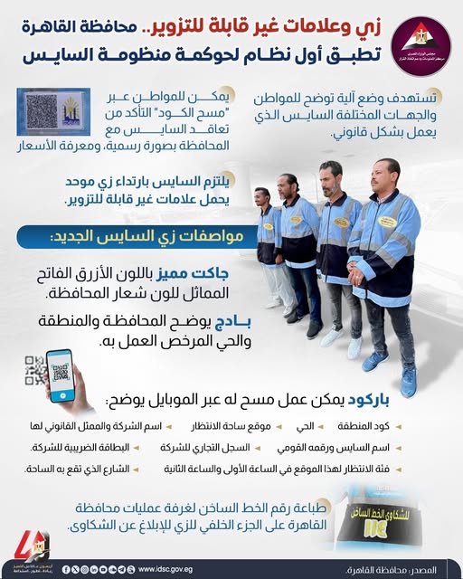 معلومات الوزراء يسلط الضوء على أول تجربة لتطبيق السايس.. زي وعلامات غير قابلة للتزوير.. كود للتعاقد الرسمي ومعرفة الأسعار.. و10 جنيه أعلى قيمة لساعة الانتظار