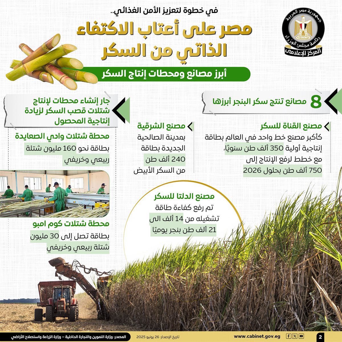 نشر المركز الإعلامي لـ مجلس الوزراء عددًا من الإنفوجرافات عبر منصاته الرسمية على مواقع التواصل الاجتماعي، استعرض خلالها جهود الدولة في التوسع بزراعة المحاصيل السكرية، ودعم الصناعات المرتبطة بها، بما يضع مصر على أعتاب تحقيق الاكتفاء الذاتي من السكر، باعتباره من السلع الاستراتيجية الهامة.