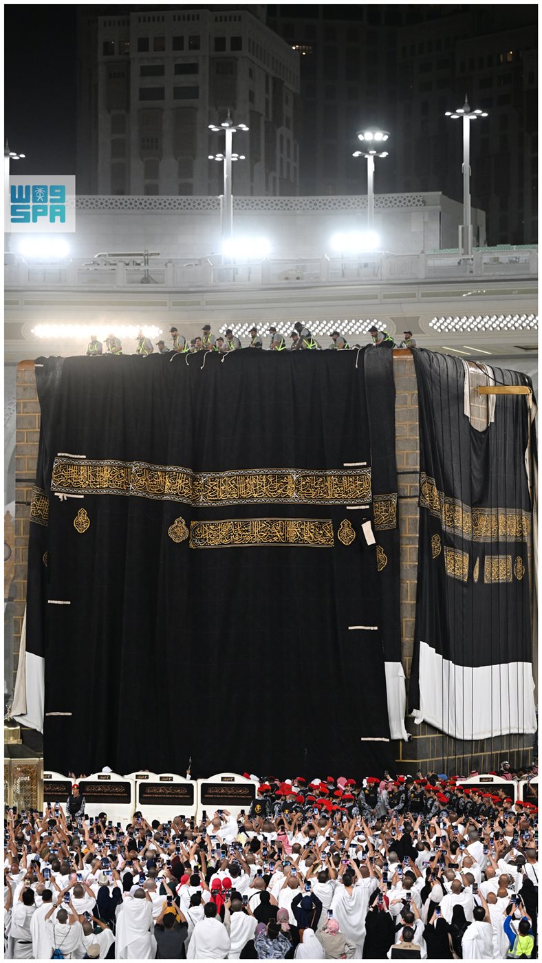 وذكرت أن الكسوة تضم 120 كيلوغراما من أسلاك الفضة المطلية بالذهب، و60 كيلوغراما من الفضة الخالصة، إلى جانب 825 كيلوغراما من الحرير، و410 كيلوغرامات من القطن الخام. ونقلت الهيئة عبر حسابها بمنصة إكس، صورا لمراسم تبديل الكسوة.