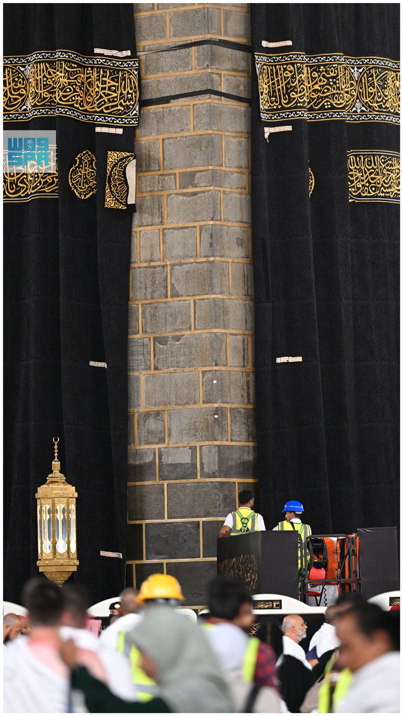 وأضافت أن الفريق المختص أنزل الستارة الخارجية لباب الكعبة، البالغ طولها 6.35 أمتار وعرضها 3.33 أمتار، تمهيدا لإسدال الكسوة الجديدة مكان القديمة.
