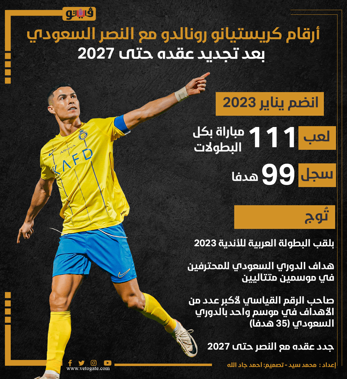 أرقام كريستيانو رونالدو مع النصر السعودي بعد تجديد عقده حتى 2027 (إنفوجراف)