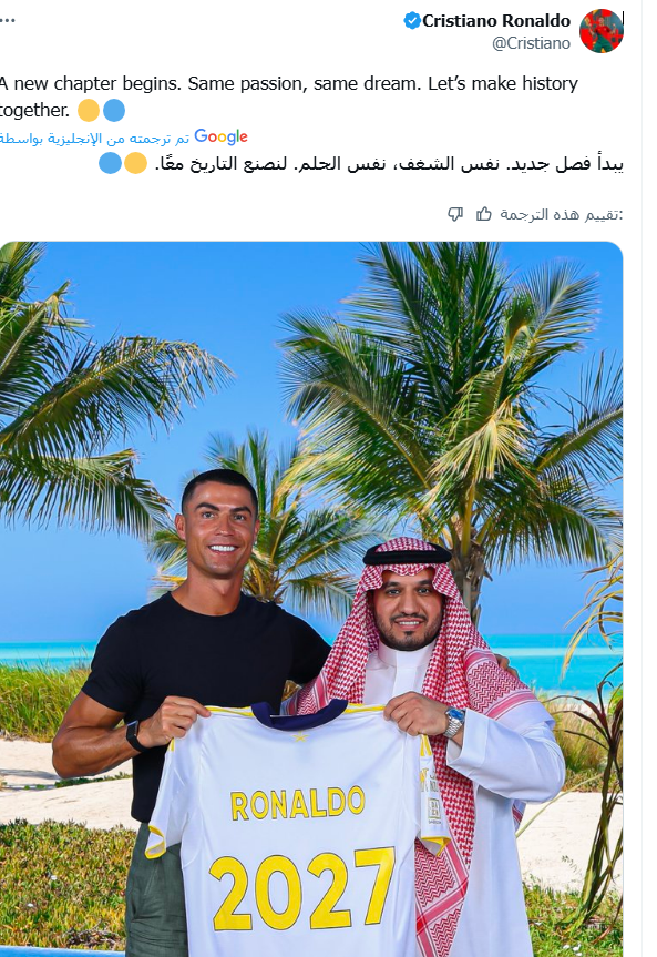 ونشر رونالدو عبر حسابه على منصة إكس قائلًا: “يبدأ فصل جديد.. نفس الشغف، نفس الحلم.. لنصنع التاريخ معًا”.