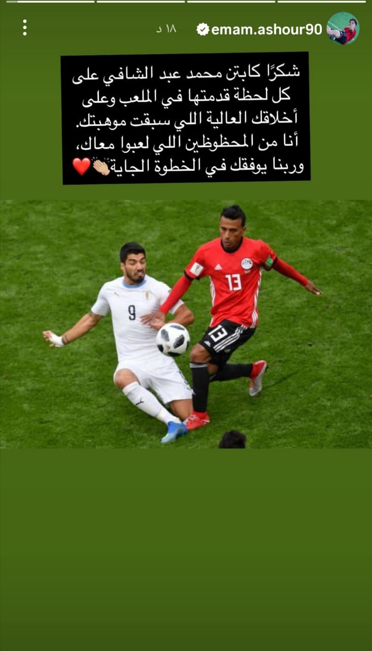 ونشر إمام عاشور عبر حسابه علي إنستجرام صورة لـ محمد عبد الشافي، وعلق عليها" شكرا كابتن محمد عبد الشافي علي كل لحظة قدمتها في الملعب، وعلي أخلاقك العالية التي سبقت موهبتك، أنا من المحظوظين إللي لعبوا معاك وربنا يوفقك في الخطوة اللي جاية.