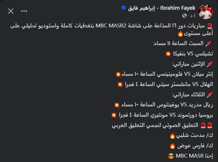 أعلن الإعلامي إبراهيم فايق عبر حسابه علي فيسبوك إذاعة عدد من مباريات دور الـ 16 من بطولة كأس العالم للأندية المقامة حاليا في الولايات المتحدة الأمريكية عبر شاشة قناة MBC MASR2.