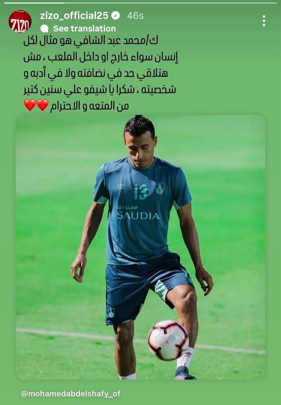 وكتب زيزو عبر حسابه الرسمي على موقع التواصل الاجتماعي إنستجرام: كابتن محمد عبد الشافي هو مثال لكل إنسان سواء خارج أو داخل الملعب، مش هتلاقي حد في أدبه وشخصيته، شكرًا يا شيفو على سنين كتير من المتعة والاحترام".