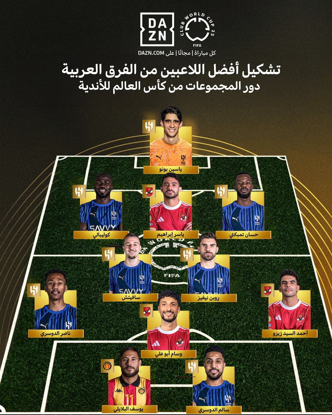 واختارت منصة "دازن عربية" (DAZN ARABIA) الناقل الحصري لمباريات كأس العالم للأندية التشكيلة المثالية العربية في الدور الأول والتي ضمت 3 لاعبين من الهلال السعودي ومثلهم من الأهلي المصري ونجمين من الترجي التونسي.