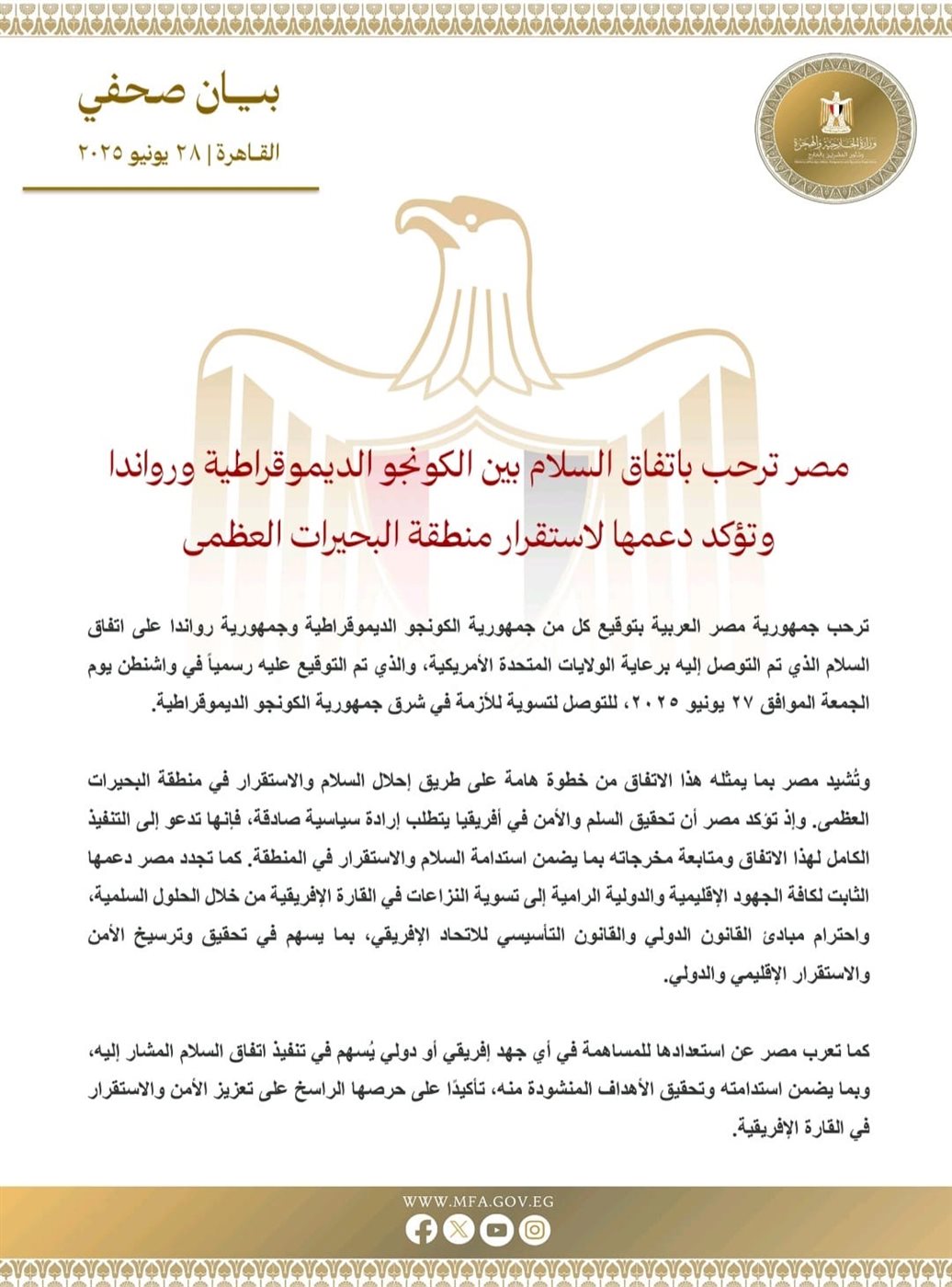 رحبت مصر بتوقيع كل من جمهورية الكونجو الديمقراطية وجمهورية رواندا على اتفاق السلام الذي تم التوصل إليه برعاية الولايات المتحدة الأمريكية، وتم التوقيع عليه رسميًا في واشنطن أمس الجمعة الموافق ٢٧ يونيو ٢٠٢٥، للتوصل لتسوية للأزمة في شرق الكونجو الديمقراطية.