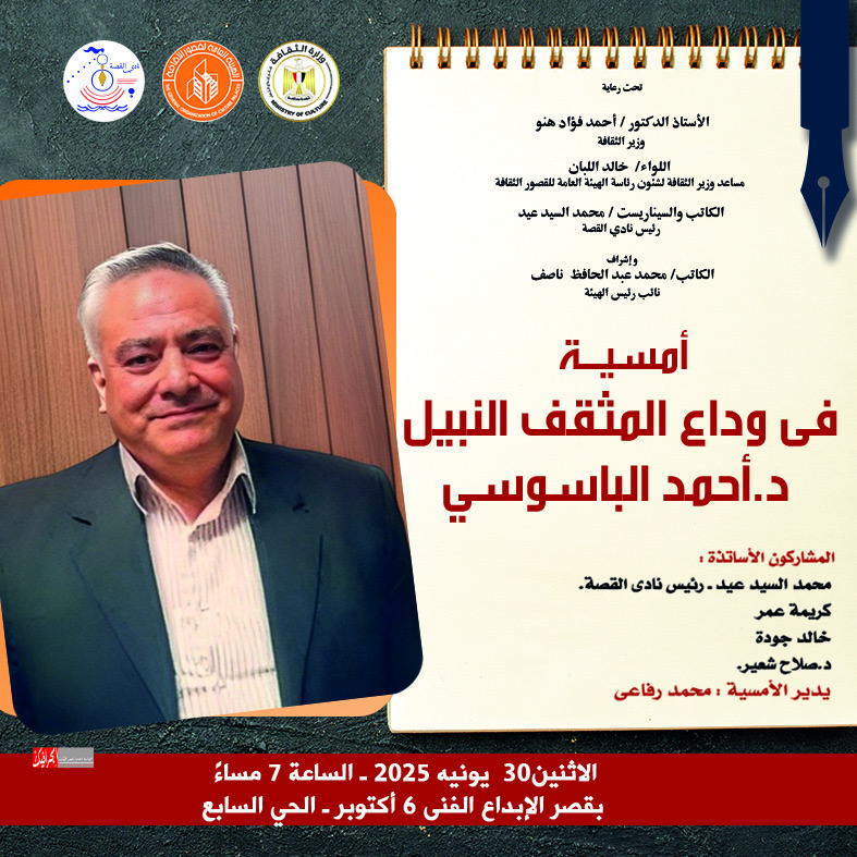 تعقد الأمسية بالتعاون مع نادي القصة، وتشهد حديثا عن مسيرة "الباسوسي" الإبداعية والإنسانية، مع الوقوف على محطات من حياته المهنية وإسهاماته الأدبية، بمشاركة كل من الكاتب والسيناريست محمد السيد عيد، رئيس نادي القصة، السيناريست د. صلاح شعير، الأديبة د. كريمة عمر، والكاتب خالد جودة، ويدير الأمسية القاص محمد رفاعي، وذلك بحضور نخبة من المثقفين والمبدعين.