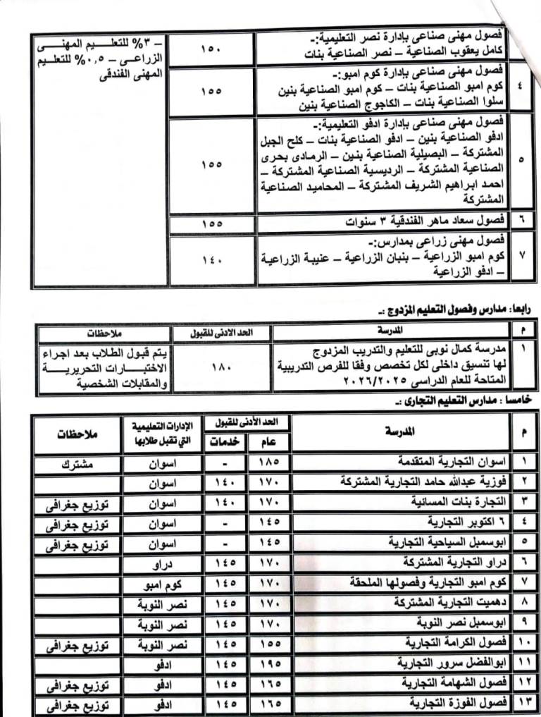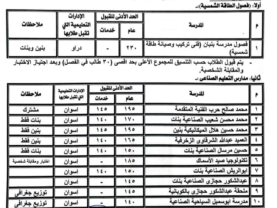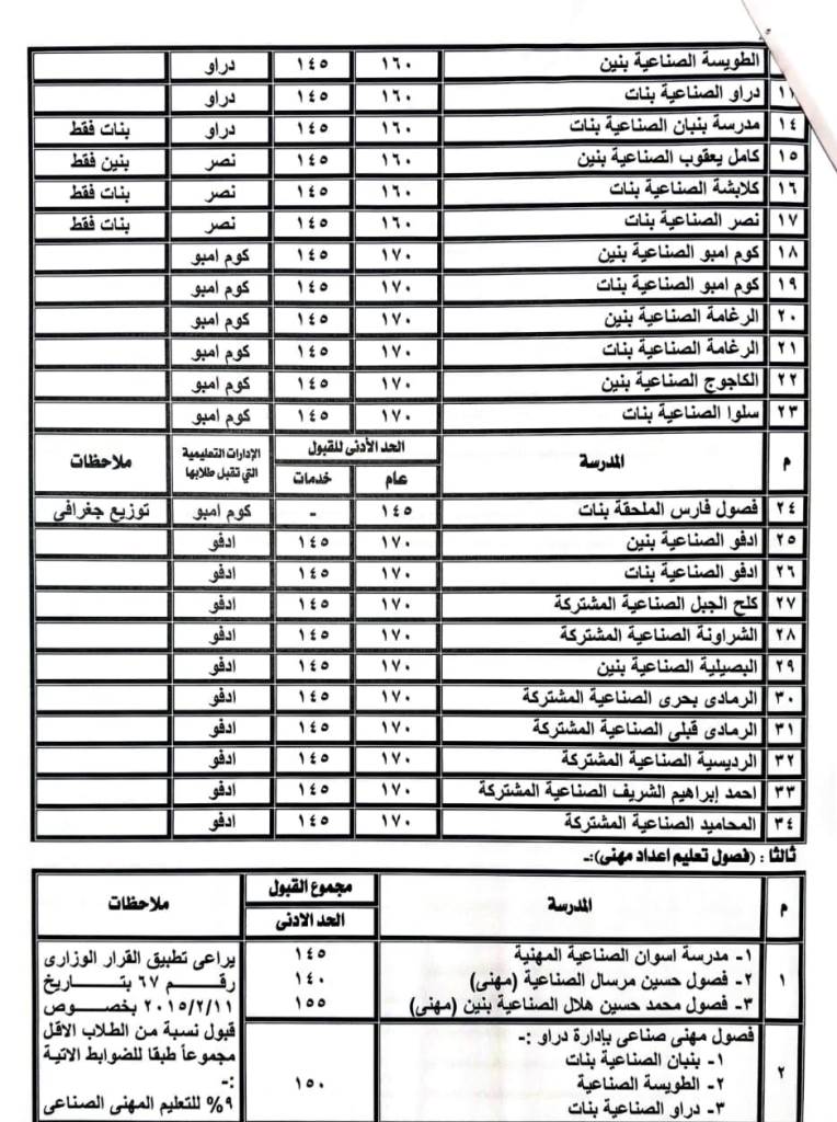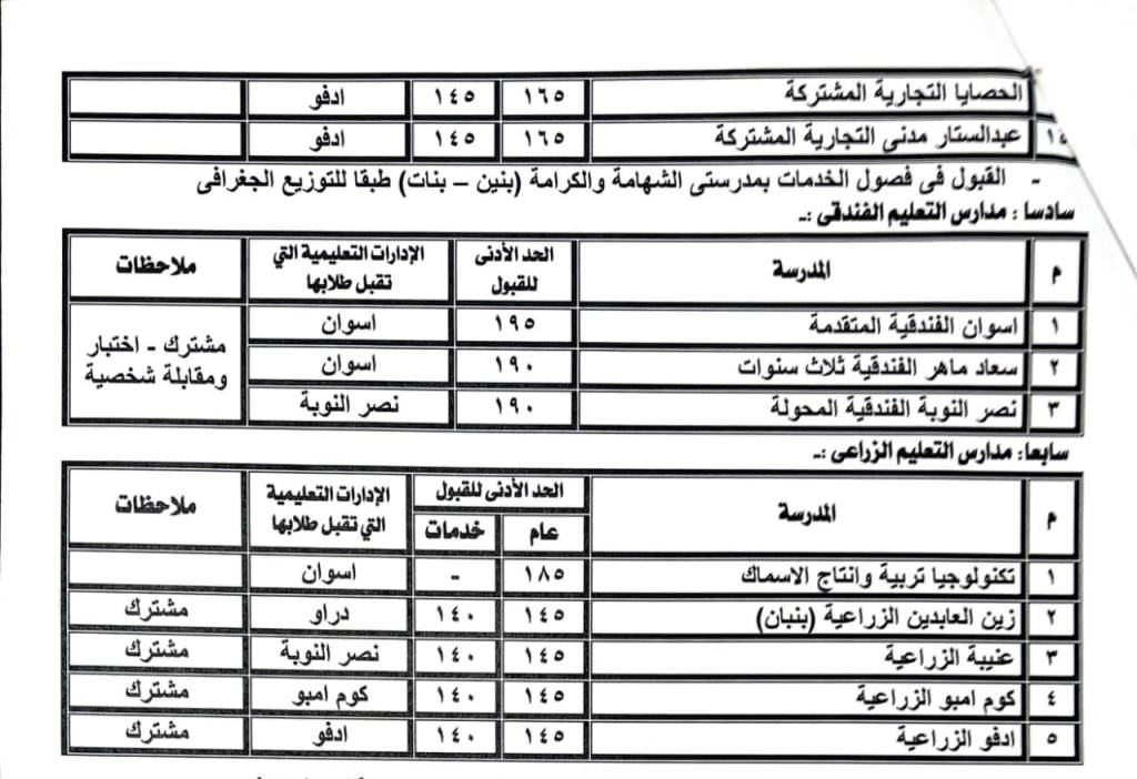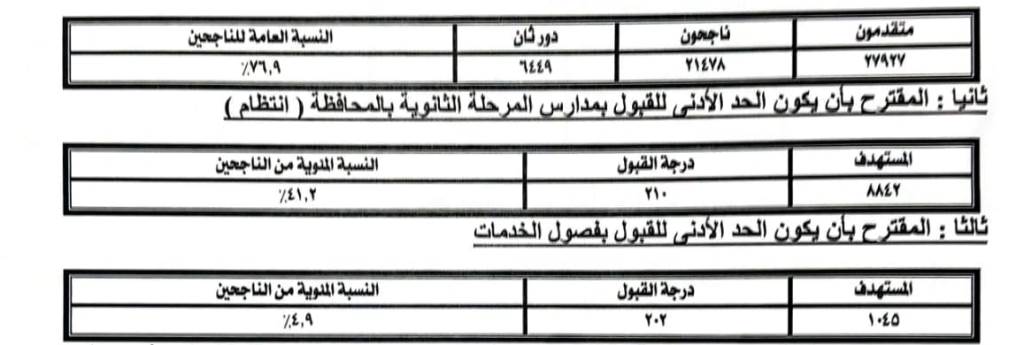 كما سيكون الحد الأدنى للقبول بالثانوى العام للخدمات 202 درجة، فى حين يتراوح الحد الأدنى للقبول بمدارس التعليم الفنى والمهنى والخدمات فنى ما بين 140 درجة إلى 230 درجة حسب نوعية المدرسة ونظام الدراسة بها.