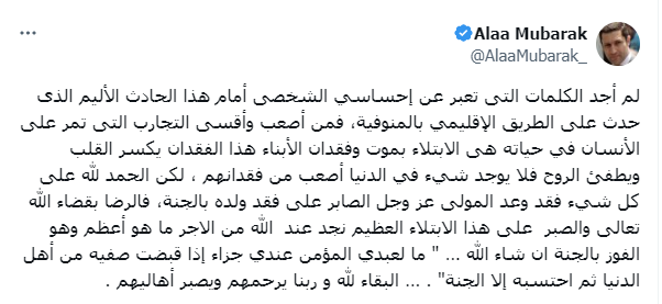 وقال علاء مبارك معبرًا عن حزنه لحادث الطريق الإقليمي: "لم أجد الكلمات التى تعبر عن إحساسي الشخصى أمام هذا الحادث الأليم الذى حدث على الطريق الإقليمي بالمنوفية".