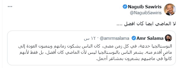 وذلك ردًا على رأي عمرو سلامة عن الحنين للماضي، التي قال فيها: "النوستالچيا خدعة، في كل زمن مضى، كان الناس يشكون زمانهم ويتمنون العودة إلى ماضٍ أقدم منه. يشعر الناس بالنوستالچيا ليس لأن الماضي كان أفضل، بل فقط لأنهم كانوا في ماضيهم يشعرون بمشاعر أجمل".