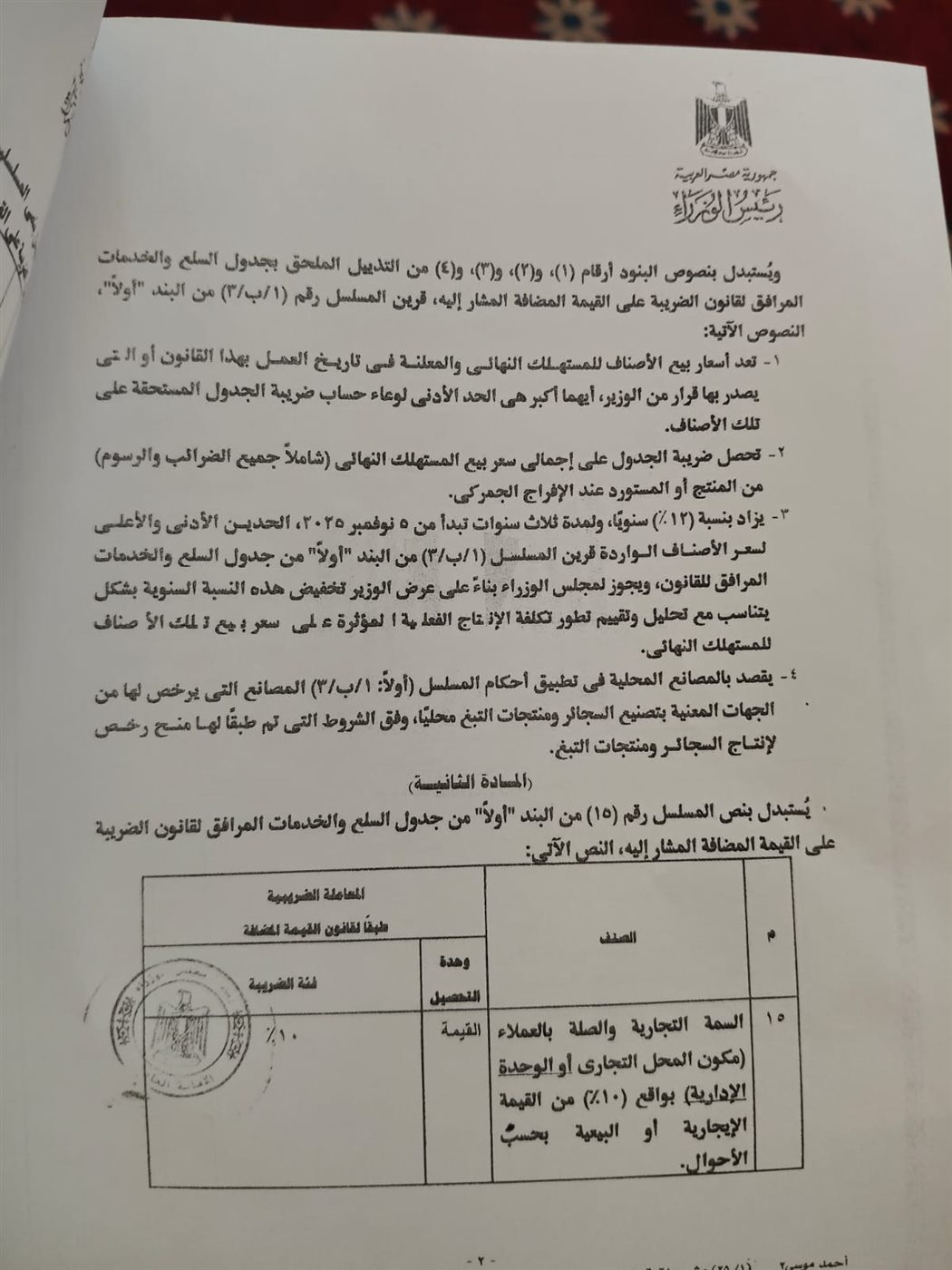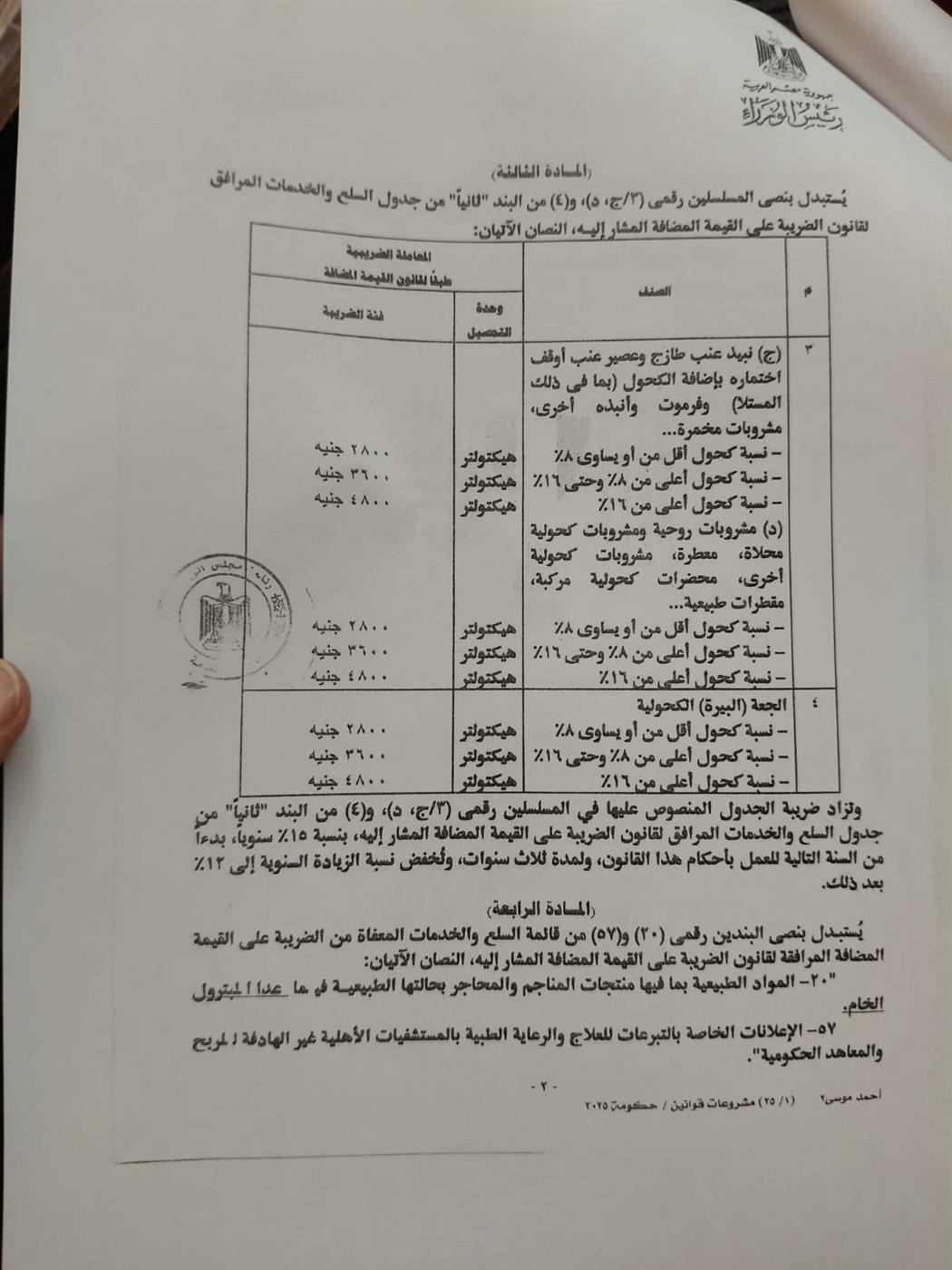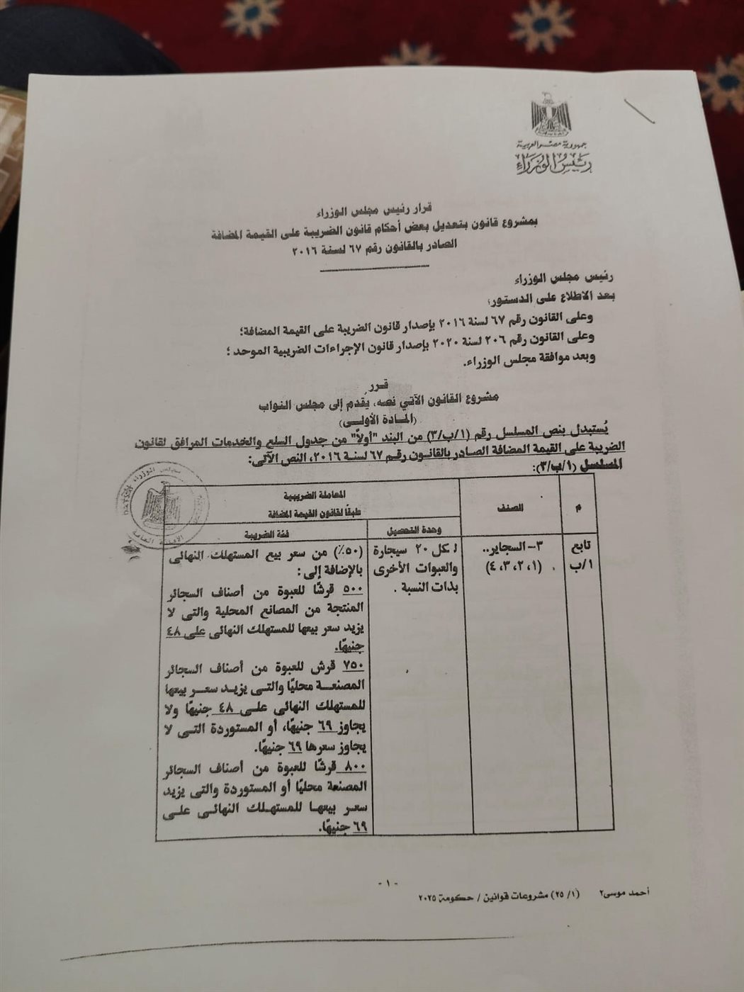 ينص مشروع القانون على استبدال نص المسلسل رقم (۱) ب /۳)، من البند " أولًا " من جدول السلع والخدمات المرافق القانون الضريبة على القيمة المضافة المشار إليه، بما يسمح بزيادة الفئة الضريبة القطعية وزيادة الحد الأقصى لأسعار أصناف السجائر المنتجة من المصانع المحلية والتي لا يزيد سعر بيعها للمستهلك النهائي على ۳۸,۸۸ جنيهًا، ليصبح الحد الأقصى لسعر بيعها للمستهلك النهائي ٤٨ جنيها.