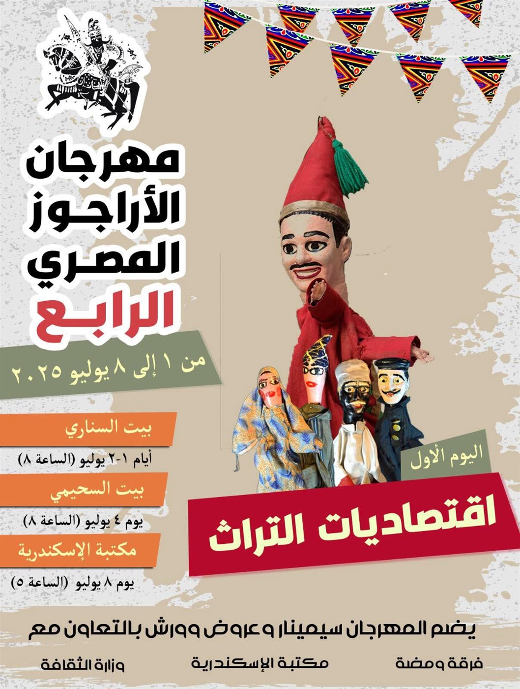 تنظم الدورة الرابعة من مهرجان الأراجوز المصري "اقتصاديات التراث" بالتعاون بين كل من بيت السناري والتابع لقطاع التواصل الثقافي بمكتبة الإسكندرية، وصندوق التنمية الثقافية، وفرقة ومضة لعروض الأراجوز وخيال الظل.