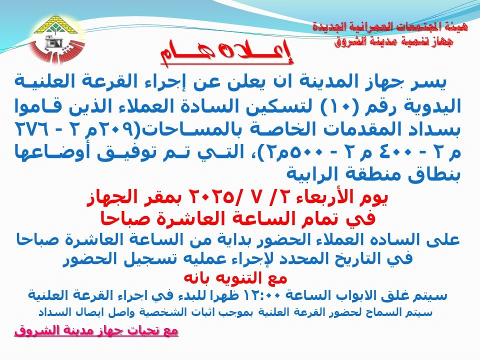 وفي هذا الإطار، أوضح المهندس محمد السيد عبد المقصود، رئيس جهاز تنمية مدينة الشروق، أنه على العملاء الحضور بداية من الساعة الـ10 صباحًا في التاريخ المحدد بمقر الجهاز، لإجراء عملية تسجيل الحضور، منوهًا أنه سيتم غلق الأبواب الساعة الـ12 ظهرًا للبدء في إجراء القرعة العلنية، وسيتم السماح لحضور القرعة العلنية بموجب إثبات الشخصية، وأصل إيصال السداد.