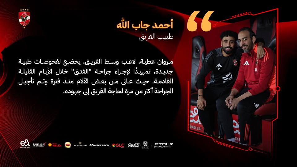 قال الدكتور أحمد جاب الله طبيب النادي الأهلي أن مروان عطية لاعب الفريق الأول بالنادي يخضع لفحوصات طبية جديدة تمهيدًا لإجراء جراحة الفتق خلال الأيام القليلة المقبلة.