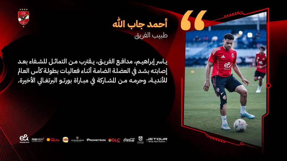 قال الدكتور أحمد جاب الله طبيب النادي الأهلي: إن ياسر إبراهيم مدافع الفريق الأول بالنادي اقترب من التماثل للشفاء بعد إصابته بشد في العضلة الضامة أثناء فعاليات بطولة كأس العالم للأندية.