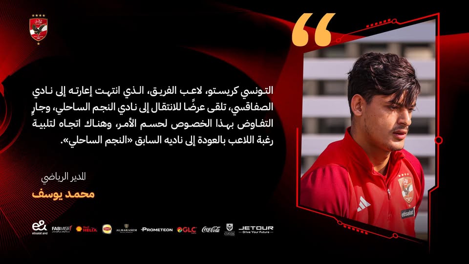 قال محمد يوسف المدير الرياضي بالنادي الأهلي: إن التونسي كريستو، لاعب الفريق، الذي انتهت إعارته إلى نادي الصفاقسي، تلقى عرضًا للانتقال إلى نادي النجم الساحلي.