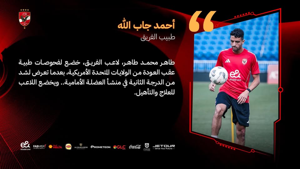 قال أحمد جاب الله طبيب الفريق الأول لكرة القدم بالنادي الأهلي، إن طاهر محمد طاهر خضع لفحوصات طبية عقب العودة من أمريكا بعدما تعرض لشد من الدرجة الثانية في منشأ العضلة الأمامية ويخضع للعلاج والتأهيل.