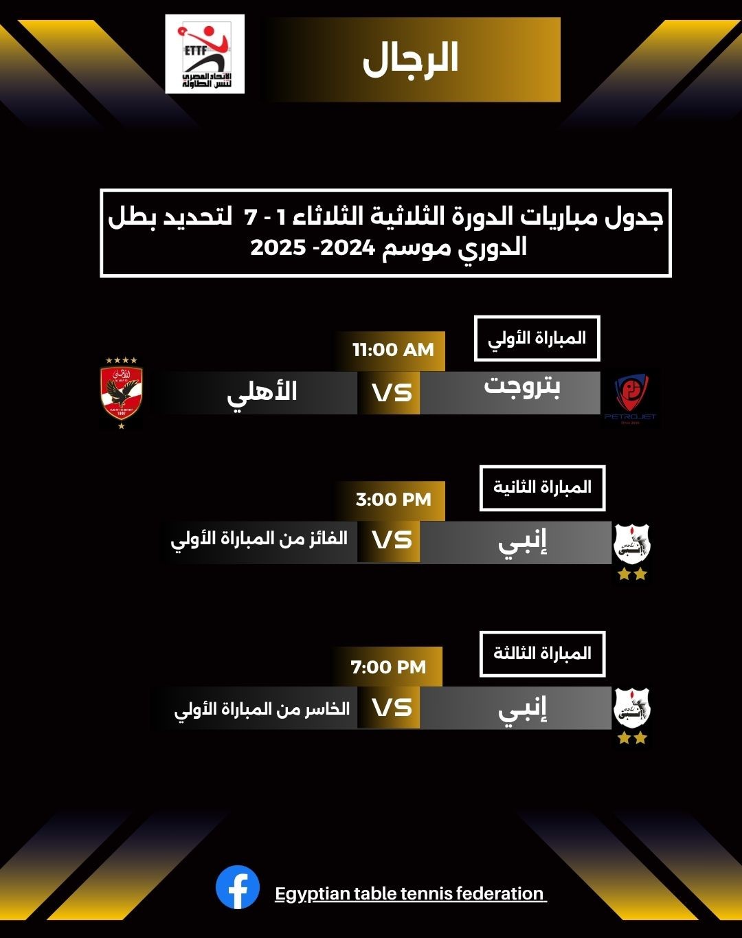 وتقرر اللجوء إلى دورة مجمعة ثلاثية لتحديد بطل دوري رجال تنس الطاولة موسم 2024/2025، بعد تساوي الأهلي وبتروجت وإنبي في مجموع نقاط الدورتين المجمعتين الأولى والثانية.