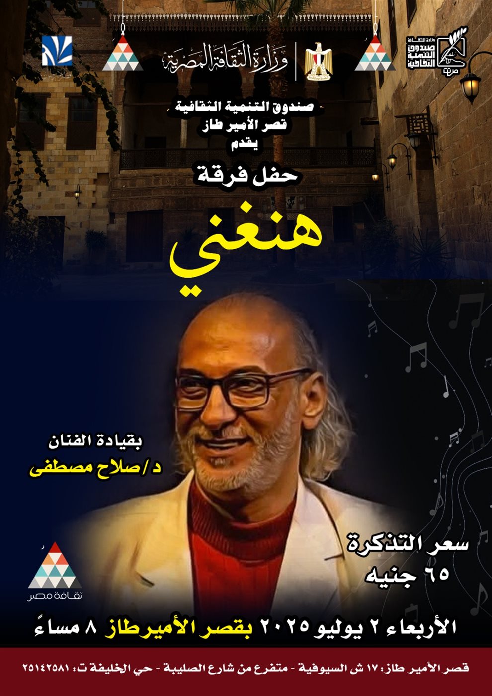 يأتي هذا الحفل في سياق الفعاليات المنتظمة التي يشهدها قصر الأمير طاز، أحد أبرز المراكز الثقافية التابعة لصندوق التنمية الثقافية، والذي يحتضن على مدار العام عددًا من الفعاليات الهادفة التي تربط بين التراث والحداثة، وتُسهم في تنشيط المشهد الثقافي في قلب القاهرة التاريخية.