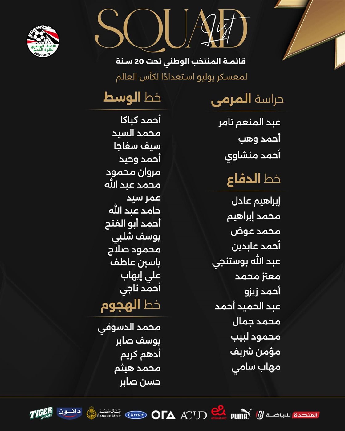 منتخب الشباب، أعلن أسامة نبيه المدير الفني لمنتخب مصر للشباب تحت 20 سنة، قائمة الفراعنة الشباب في المعسكر المفتوح الذي ينطلق من يوم 3 حتى 31 يوليو الجاري، استعدادا لبطولة كأس العالم للشباب، التي تقام في ضيافة دولة تشيلي في الفترة من في الفترة من 27 سبتمبر إلى 21 أكتوبر المقبلين في دولة تشيلي.