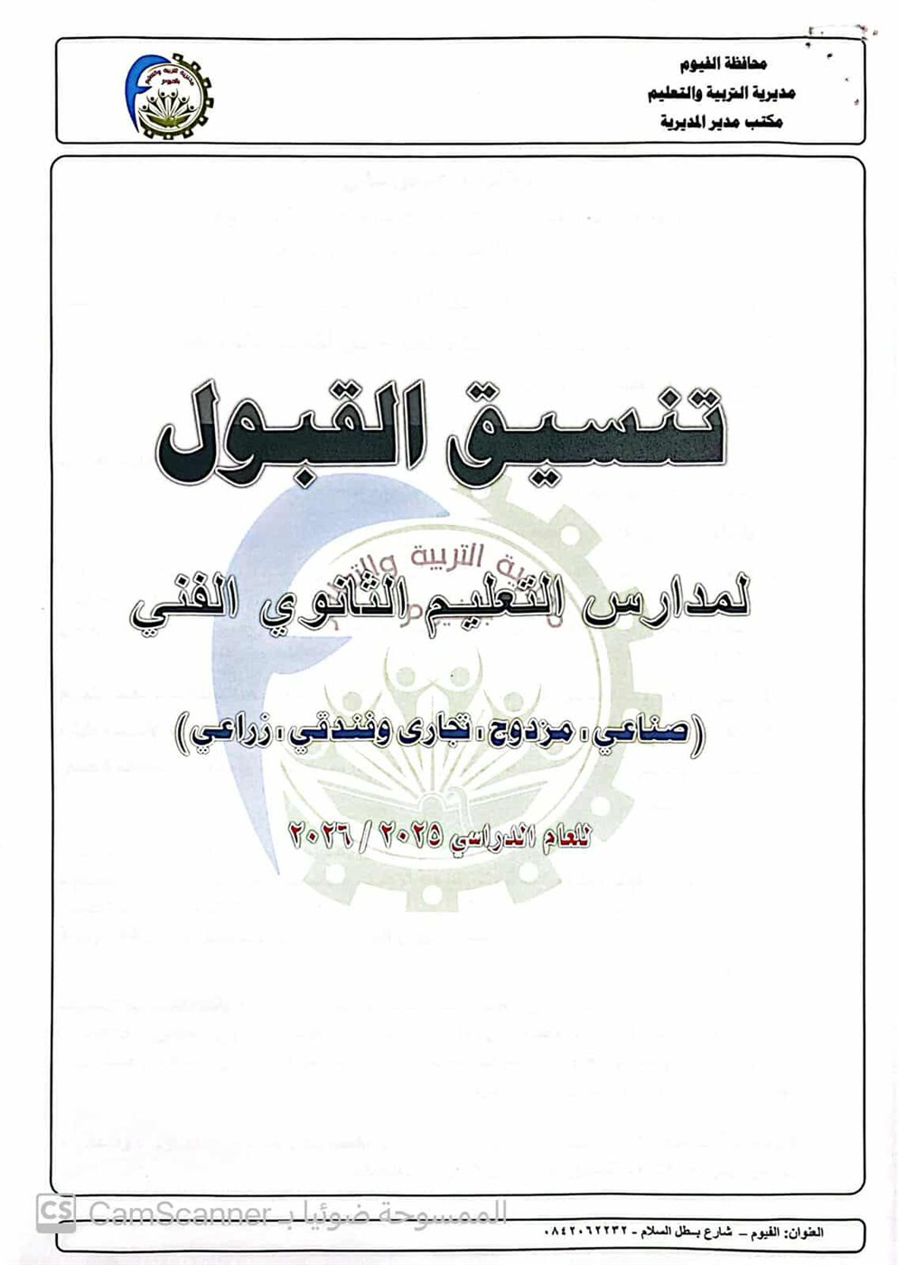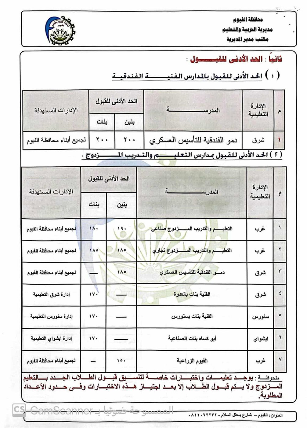 فيما جاء تنسيق مدارس التعليم الثانوي الفني " صناعي، زراعي، تجاري، فندقي، مزدوج"، حيث تم تحديد الحد الأدنى للقبول بمدرسة دمو الفندقية للتأسيس العسكري "بنين وبنات" بمجموع 200 درجة، والحد الأدنى للقبول بمدارس التعليم والتدريب المزدوج كالتالي، مدرسة التدريب والتعليم المزدوج صناعي، بإدارة غرب الفيوم التعليمية، بمجموع 190 درجة للبنين، ومجموع 180 درجة للبنات، ومدرسة التعليم والتدريب المزدوج تجاري "بنين وبنات"، بإدارة غرب الفيوم التعليمية بمجموع 185 درجة، ومدرسة دمو الفندقية للتأسيس العسكري "بنين"، بإدارة شرق الفيوم التعليمية، بمجموع 185 درجة، والمدرسة الفنية بنات بالعدوة، التابعة لإدارة شرق الفيوم التعليمية، بمجموع 170 درجة، والمدرسة الفنية بنات بسنورس بمجموع 170 درجة، ومدرسة أبوكساه الصناعية للبنات بأبشواي، بمجموع 170 درجة، ومدرسة الفيوم الزراعية "بنين" بإدارة غرب الفيوم التعليمية، بمجموع 150 درجة، وتوجد تعليمات واختبارات خاصة لتنسيق قبول الطلاب الجدد بالتعليم المزدوج، ولا يتم قبول الطلاب إلا بعد اجتياز هذه الاختبارات وفي حدود الأعداد المطلوبة.